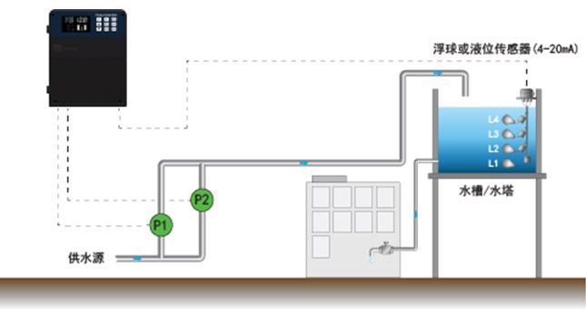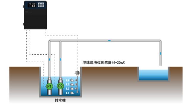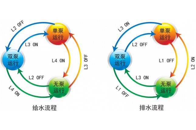 可以通過(guò)設(shè)定項(xiàng)目設(shè)置為給水控制方式或排水控制方式??刂破骺芍苯訋лd7.5kW及以下功率的水泵,對(duì)于7.5kW以上的水泵可通過(guò)擴(kuò)展MCC柜實(shí)現(xiàn)控制功能。