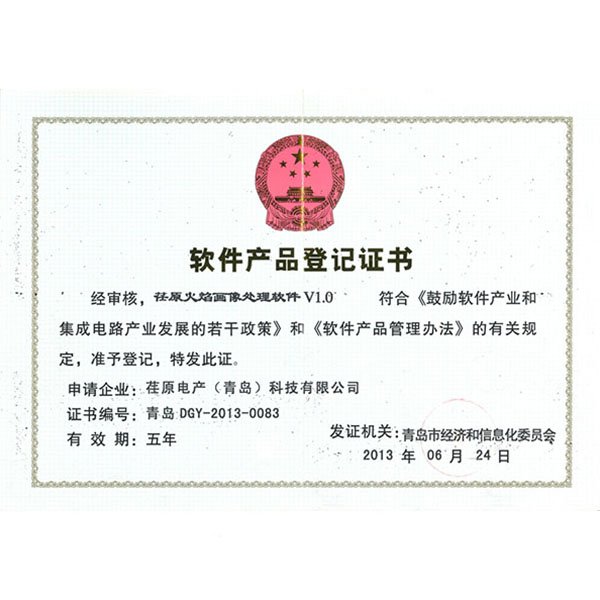 “荏原火焰畫像處理軟件V1.0”軟件產(chǎn)品登記證書