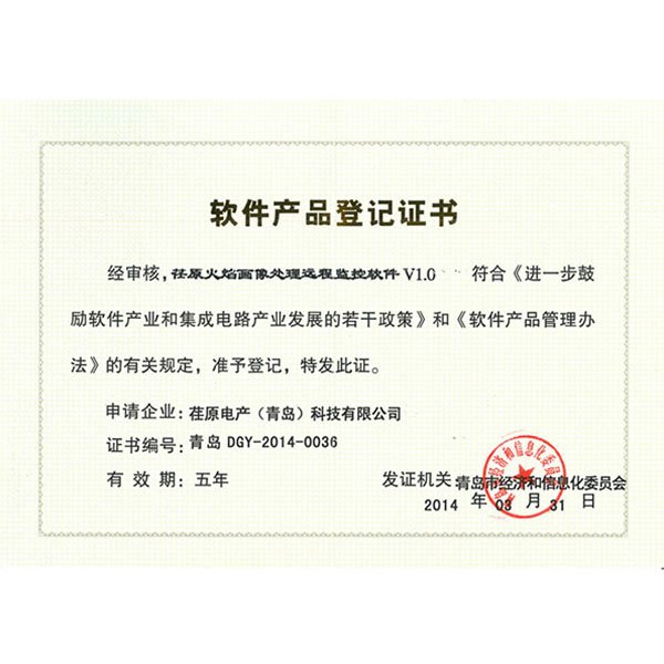 “荏原火焰畫像處理遠(yuǎn)程監(jiān)控軟件V1.0”軟件產(chǎn)品登記證書