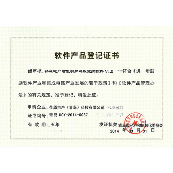 “荏原電產(chǎn)智能鍋爐遠(yuǎn)程監(jiān)控軟件V1.0”軟件產(chǎn)品登記證書
